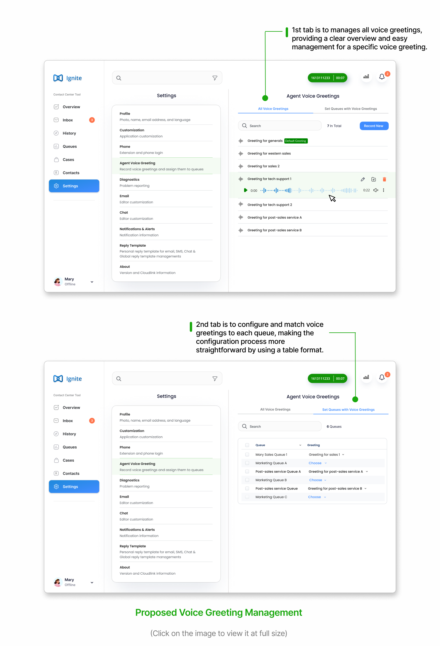 The second tab configures and assigns voice greetings to specific queues, simplifying the process through a table format. This design also supports bulk actions, enabling agents to select multiple rows at once to enhance efficiency.