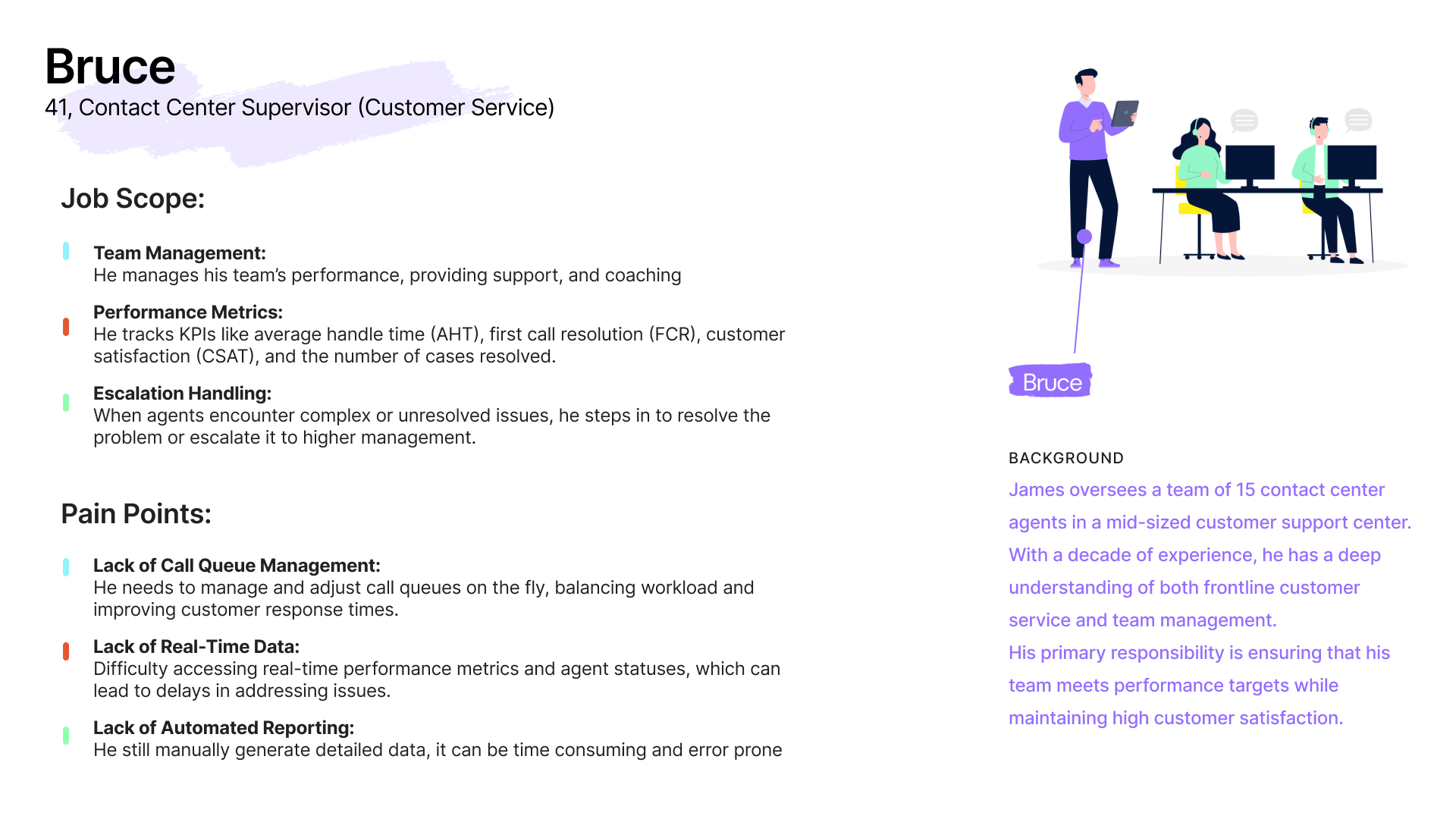 • Bruce: a contact center supervisor responsible for a team of 15 agents, focusing on performance targets, real-time data monitoring, and issue escalation. He encounters challenges with tracking real-time metrics, managing call queues, and handling manual reporting tasks.