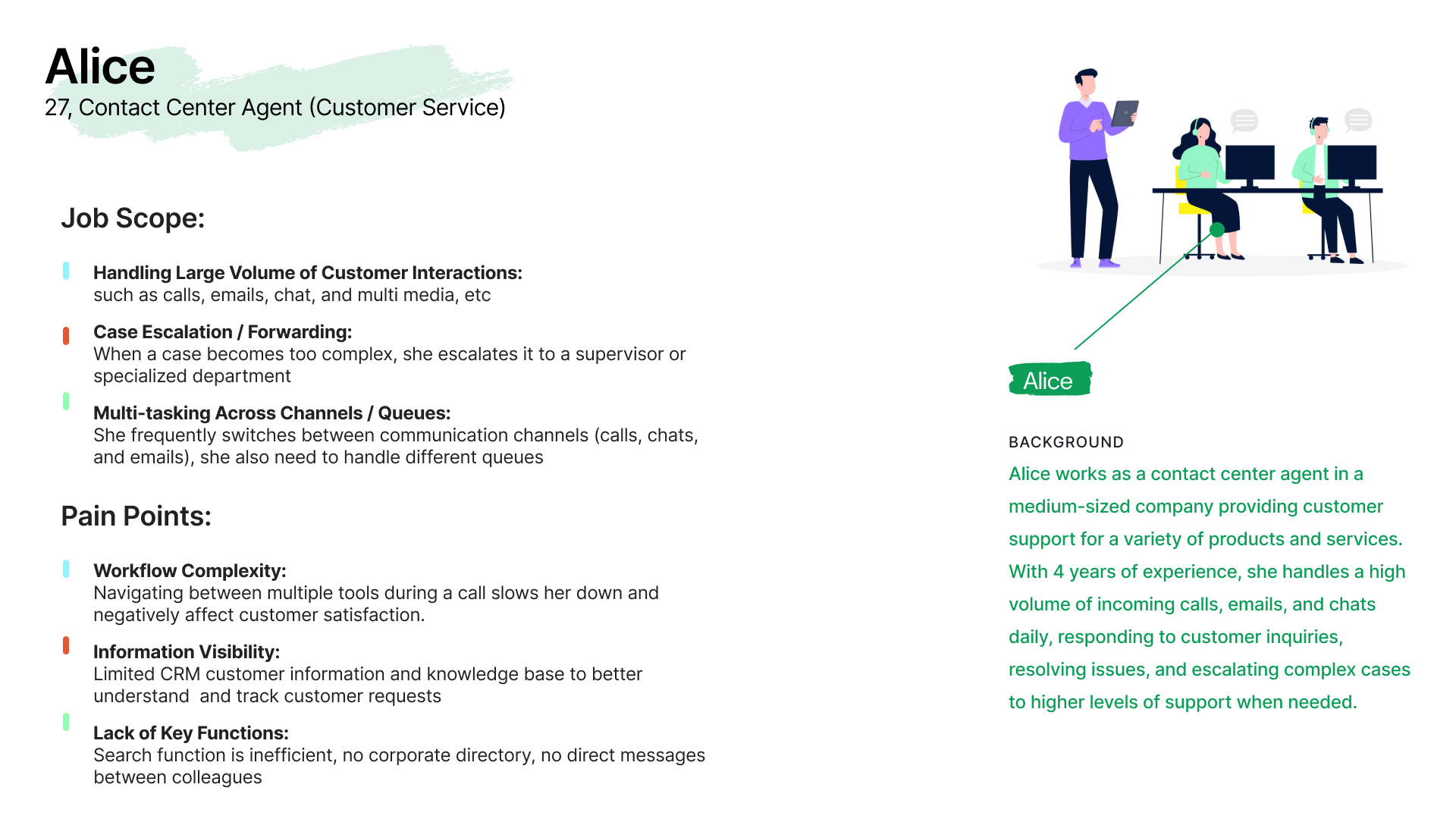 • Alice: a contact center agent who manages high volumes of customer interactions across multiple channels but struggles with workflow complexity, limited visibility of information, and lacks essential tools like unified search and colleague messaging.