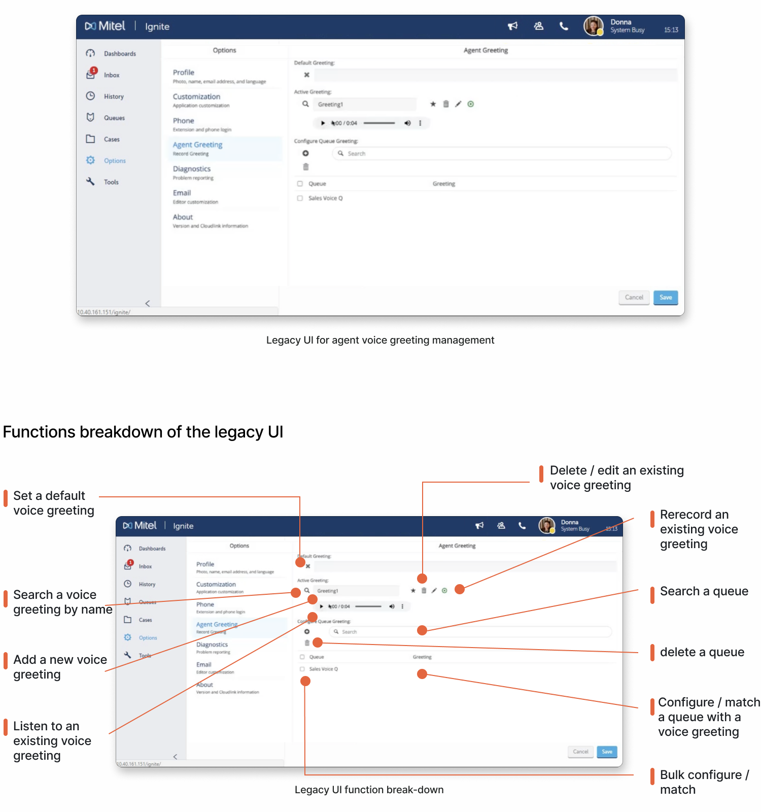 As shown in the screenshot below, while the previous UI provided all essential functionalities for agents, it struggled with a poor information hierarchy. The interface was confusing, with no clear display of existing voice greetings or guidance on how to match them to a specific queue.