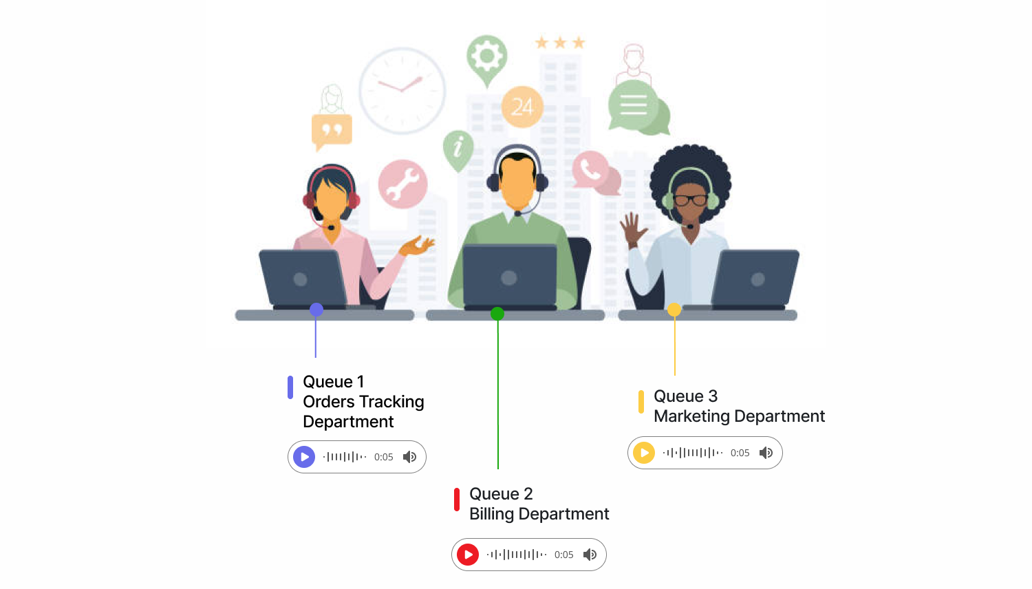 A voice greeting is a pre-recorded voice message that plays for customers when they call a company’s contact center. A queue, on the other hand, is a virtual waiting line where incoming calls, messages, or inquiries are held until an agent is available. Queues are often categorized by the type of customer need.